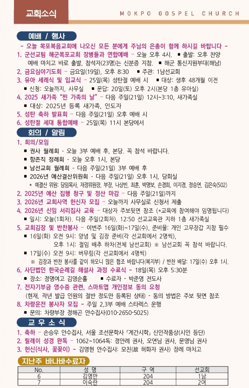 2025년 12월 14일 교회소식